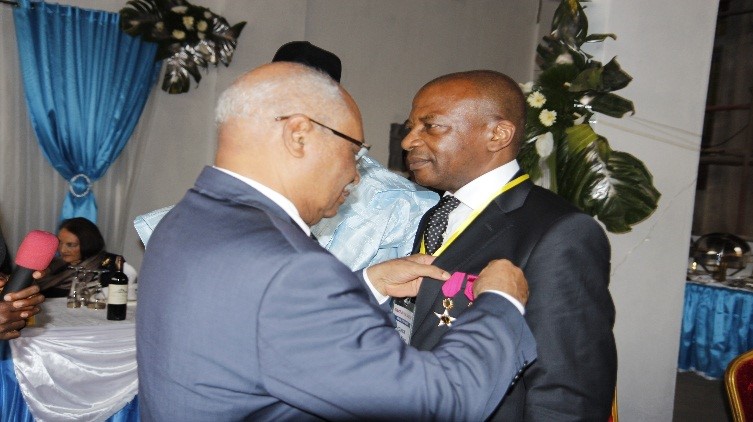 Le Ministre d’Etat épinglant la médaille du Président du TCS (à gauche) et du Procureur Général près de la Cour d’Appel du Centre (à droite)